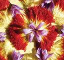 گل ها دارای 3 پرچم و یک مادگی منتهی به کلاله ی سه شاخه به رنگ قرمز متمایل به نارنجی است. قسمت مورد استفاده این گیاه، انتهای خامه و کلاله سه شاخه است که به نام زعفران مشهور است و دارای بوی معطر با طعم کمی تلخ می باشد. انتشار جغرافیایی زعفران در ایران شامل استان خراسان (قائنات، بیرجند و گناباد)، یزد، کرمان، گیلان و مازندران می باشد. در سال های اخیر زعفران در کرج و قم نیز کشت شده است.